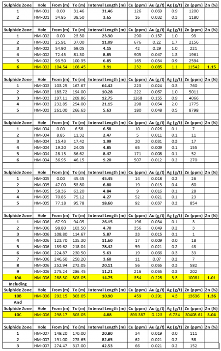 - HM-006 ended in 10.90 m of 0.291 g/t Au and 1.36% Zn from 292.15 to 303.05m (See Figure 5: Section B).