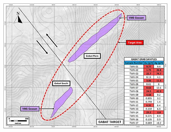 - Fifteen grab samples collected from the Gabat VMS gossan returned excellent grades for gold and silver, with 6 returning over 5 g/t Au and 3 returning over 20g/t Au to a high of 29.2 g/t Au, while 6 samples returned over 10 g/t Ag to a high of 118 g/t Ag.