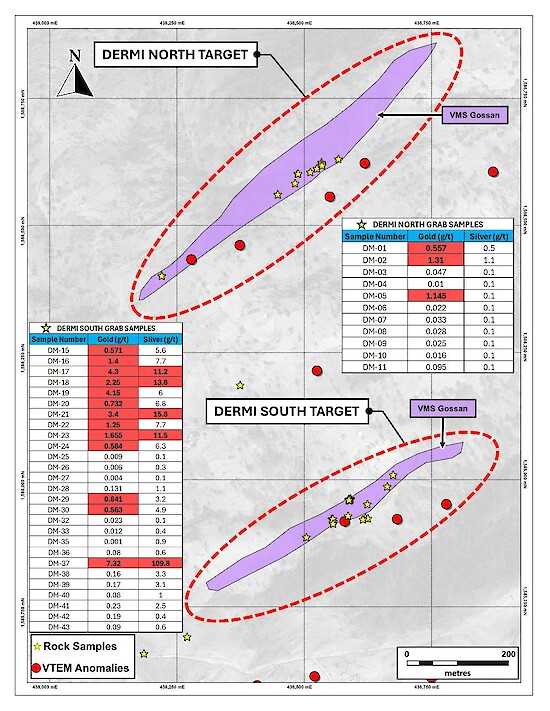 - Rock samples collected from the Dermi Main VMS zones have returned up to 7.32 g/t Au and 109.8 g/t Ag.