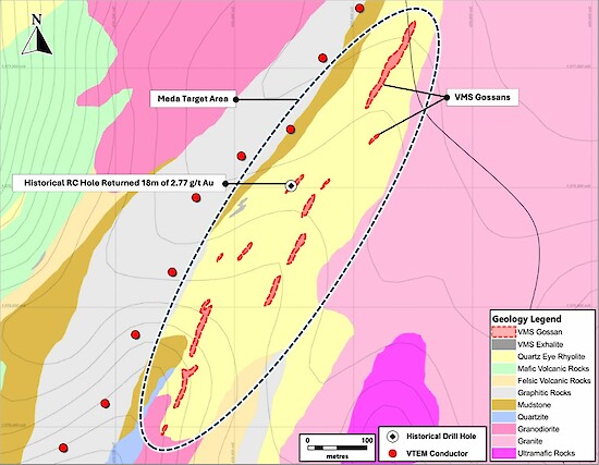 - Sub-regional geological mapping has defined three sub-parallel VMS zones oriented on a northeast-southwest trend for 1.7km and are associated with VTEM conductor anomalies.