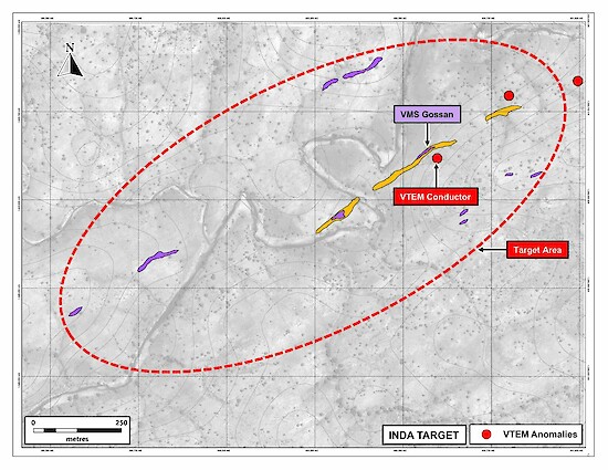 - The Aray Target comprises a series of sub-parallel northeast-southwest oriented geologically mapped VMS zones trending for over 1.5km long coinciding with VTEM conductor anomalies.