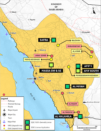 SDC is the first foreign-owned junior explorer to secure 100% ownership of six (6) exploration licenses covering approximately 438 km² located within the highly prospective Volcanic Massive Sulfide (VMS) trend of the Arabian-Nubian Shield in Saudi Arabia. These licenses, which were acquired after extensive research and field investigation work, have direct geological similarities to gold and base metal deposits previously explored and developed by the Sun Peak leadership team. Projects with granted licenses include (Figure 1):